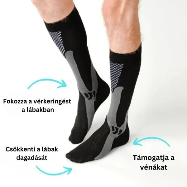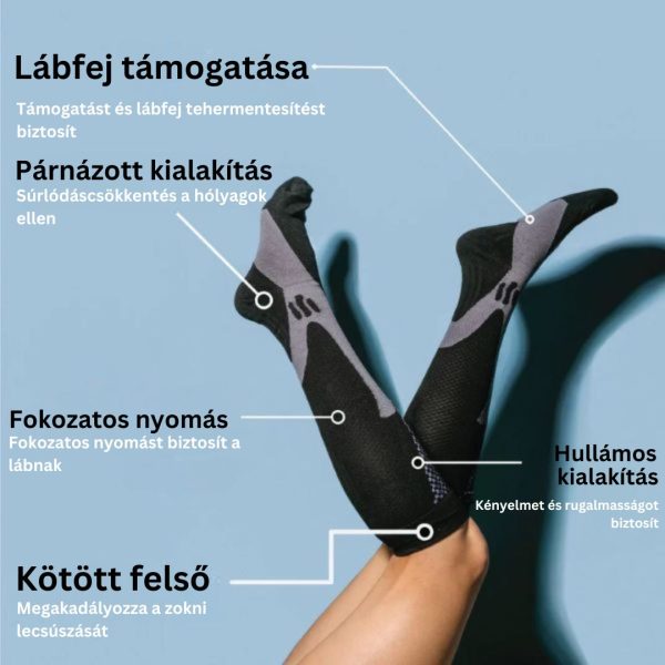 Ezek a zoknik segítenek javítani a véráramlást, ami kevesebb fáradtságot és több energiát jelent a nap folyamán. Tökéletes a hosszú órákon át tartó talpon álláshoz vagy intenzív fizikai aktivitáshoz.