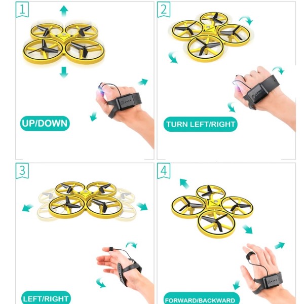 1. Emelkedés és ereszkedés: Nyomja meg az ujján lévő gombot. A drón a kar magasságának változását követi.