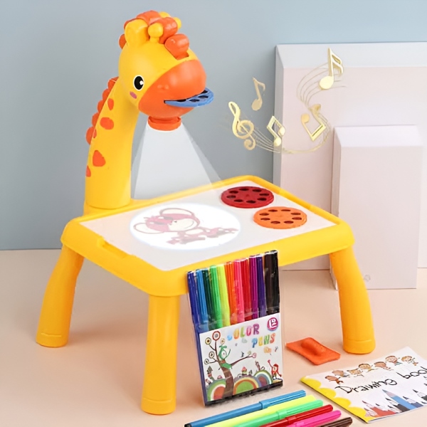 Színes, zsiráf témájú vetítő, amely figyelemfelkeltő és szórakoztató a gyerekek számára, miközben fejleszti a motoros és kognitív képességeiket.