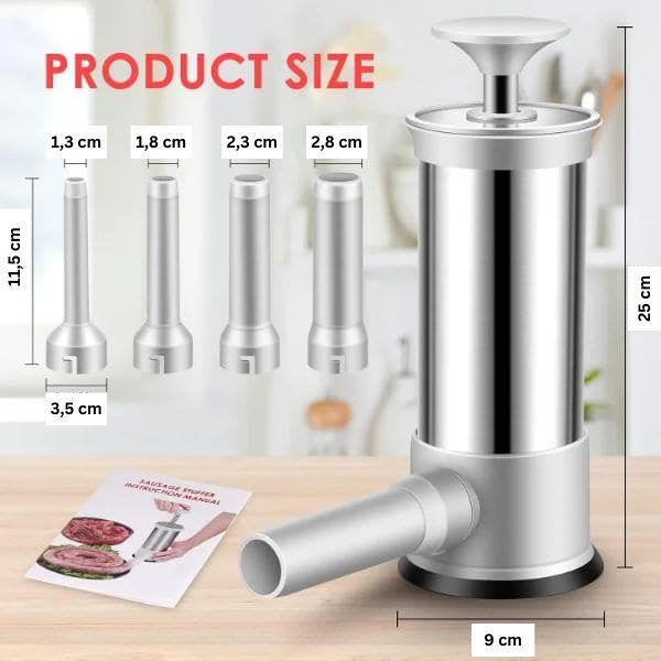 Ez a kolbásztöltő négy különböző átmérőjű PP fúvókát tartalmaz: 1,3 cm. 1,8cm, 2,3cm és 2,8cm.